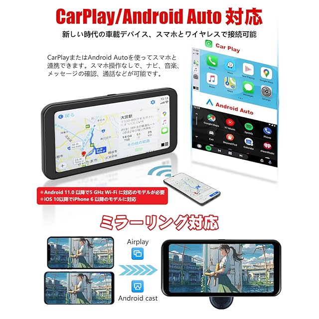 【高速ワイヤレス接続でCarPlay/Android Auto対応】ワイヤレスでCarPlayおよびAndroid Autoに対応しており、スマートフォンとの接続が簡単で迅速。わずか21秒で接続が完了し、短時間の停車後でも自動で接続され、以前の画面に戻ります。これにより、車に乗り込んでからすぐにナビゲーションや音楽、メッセージなどを安全に利用できます。さらに、AirPlayやAndroid Castによる画面ミラーリング機能も搭載しており、スマホの画面をディスプレイに映し出すことができ、便利なドライブ体験をサポートします。車内での操作がもっと快適に、もっと安全に!