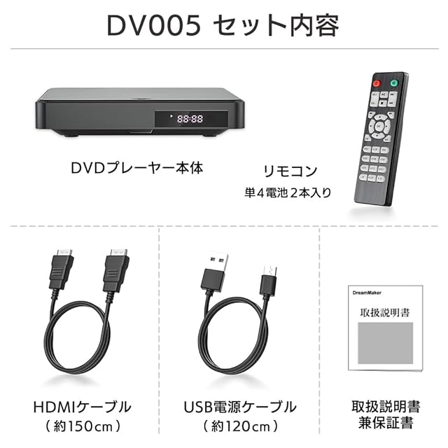 DreamMaker 車載用 ミニDVDプレーヤー DVD/CD再生専用モデル HDMI出力 USB給電 リージョンフリー 1080Pサポート CPRM対応 地上デジタル放送 Blue-ray非対応 リモコン付き DV005