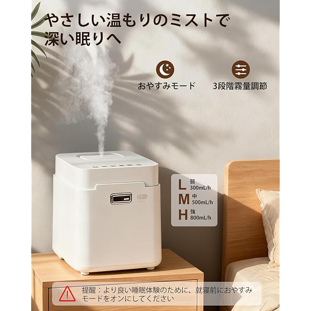 商品名:加湿器 スチーム式 加熱式 大容量. 3.3L 加湿量 800ml/h 22叠 100℃高温除菌 ミスト3段階 恒湿 Mifasol加湿器 切タイマー付き お手入れ簡単 静音 空焚き防止 寝室/子供部屋/事務所/居間/リビング/オフィス (ホワイト)