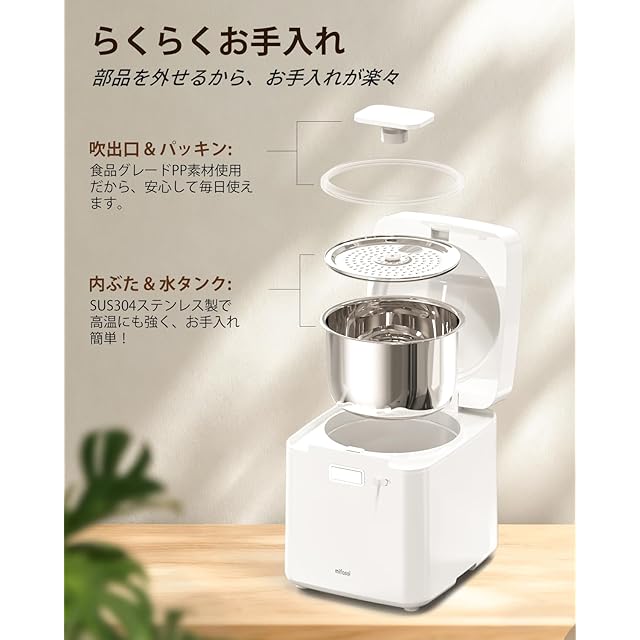 【304 ステンレス鋼でお手入れ簡単】mifasol の寝室用スチーム式加湿器は、使いやすさを重視して設計されており、食器洗い機で洗える食品用 304 ステンレス鋼で作られた水タンクを備えています。プラスチック製水タンクよりも衛生的で健康的で、さらに丈夫で耐久性があります。外せる内蓋とシリコンパッキンは細かく分解でき、隅々まで清掃できます。加湿器加熱式はフィルターレスなため、お手入れが楽だけでなくフィルター交換不要で、財布にも優しいです。