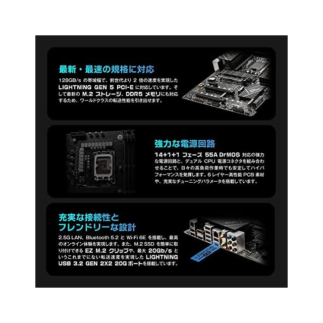 Intel 2.5G LAN + Wi-Fi 6Eを搭載し高速なネットワーク環境を構築することが可能です。
