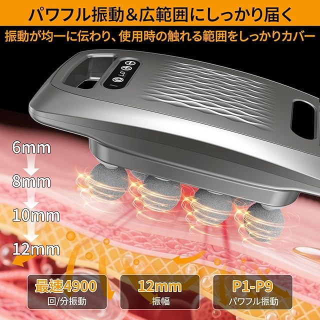 【4900mm/s 高周波振動で広範囲をカバー】当筋膜リリースガンは、高周波振動モーターを搭載し、最大 4900 回 / 分の高周波振動を実現しています。6mm~12mm の異なる作用範囲に対応し、しっかりとした振動を伝えることができます。従来の筋膜リリースガンのモーターに比べ、パワーが 10 倍以上あるため、従来は作用しにくかった範囲も、10 ヘッドの配置との組み合わせで均等かつ広く振動を届けます。動作音の小さい静音設計を採用しているため、寝室で夜間使用しても周囲に迷惑をかける心配がありません。