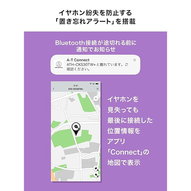 置き忘れアラートとIP55相当の防水・防じん性能:Bluetooth接続の電波が弱くなっていることを知らせる「置き忘れアラート」を ONにすると、接続が途切れる前にイヤホンから離れていることに気付くことができます。JIS 保護等級:IP55 相当(イヤホンのみ)*。日常のさまざまなシーンでイヤホンが使える高い防水性能と、砂ぼこりなどの環境下でも使える防じん性能を採用。